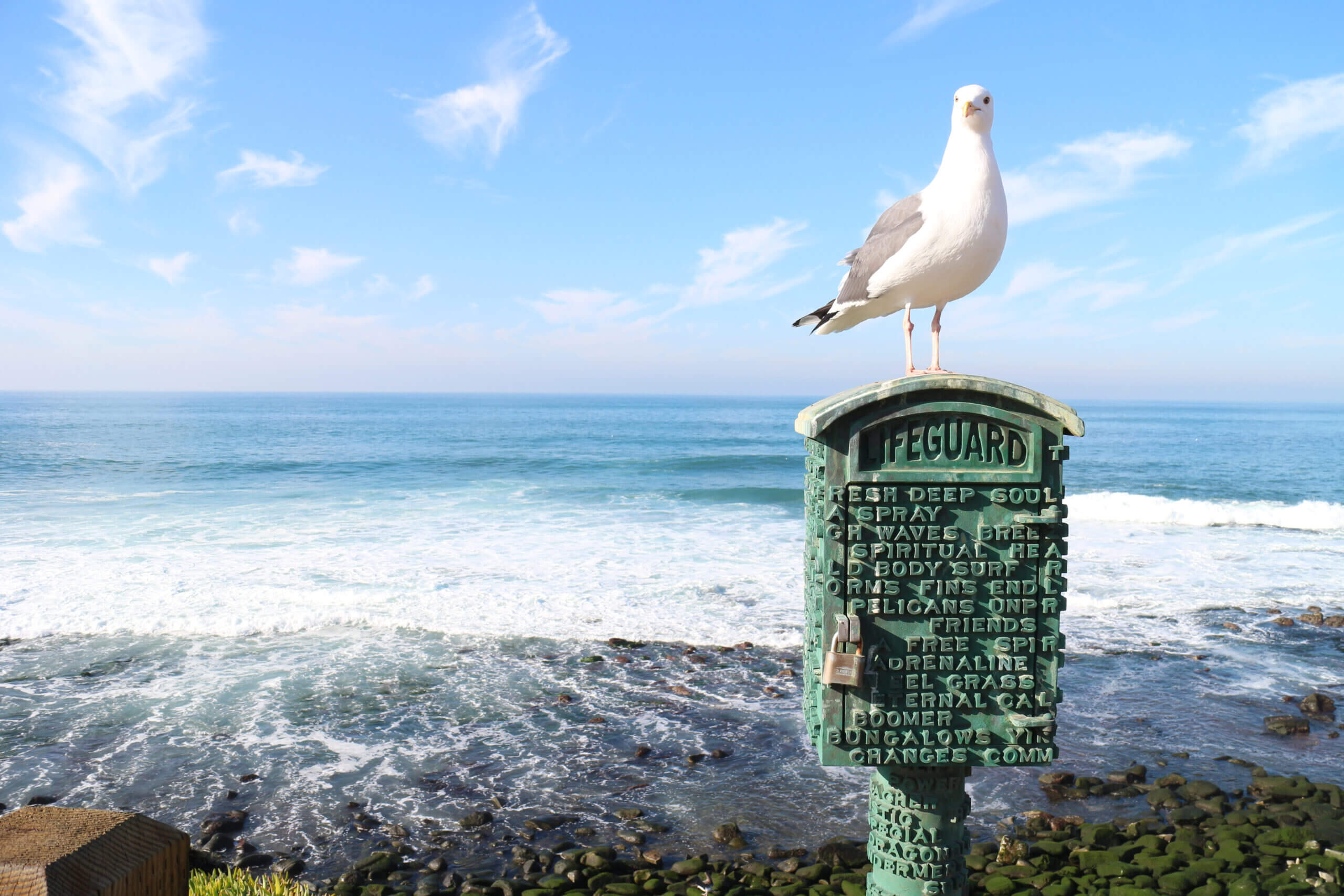 海岸沿いにいるポストに乗ったカモメの写真です。