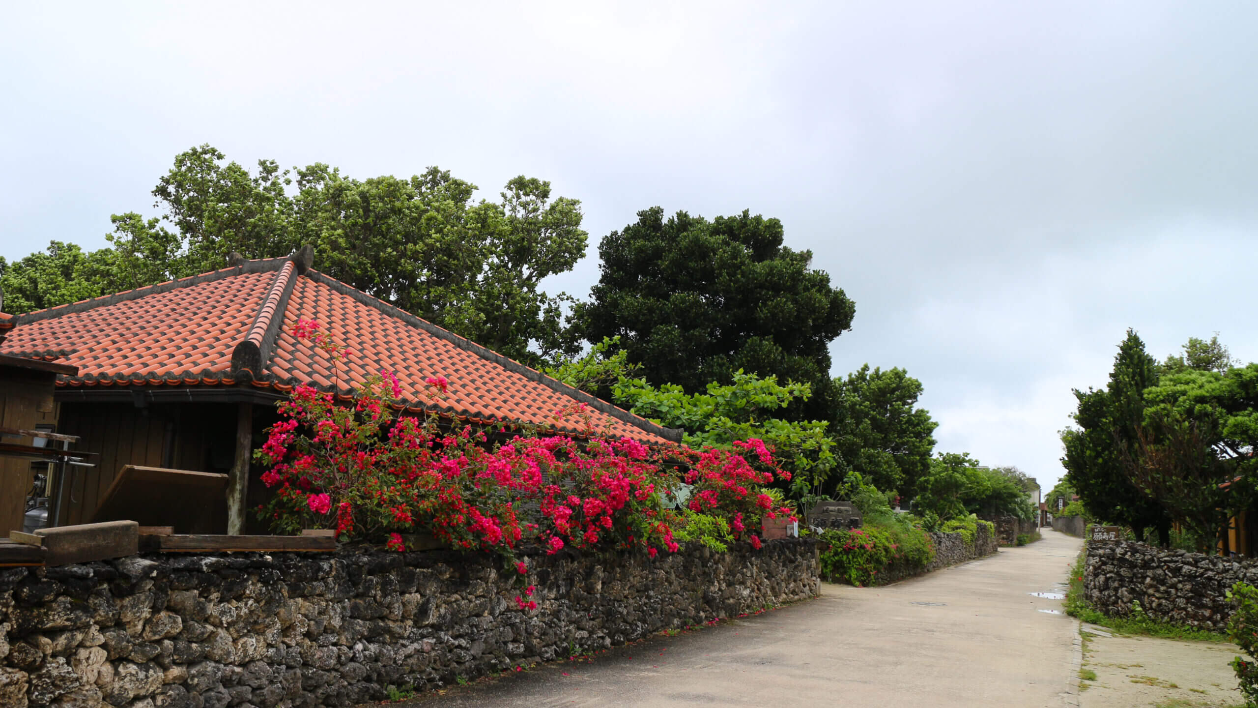 沖縄県武富島の石垣のある道の写真です。