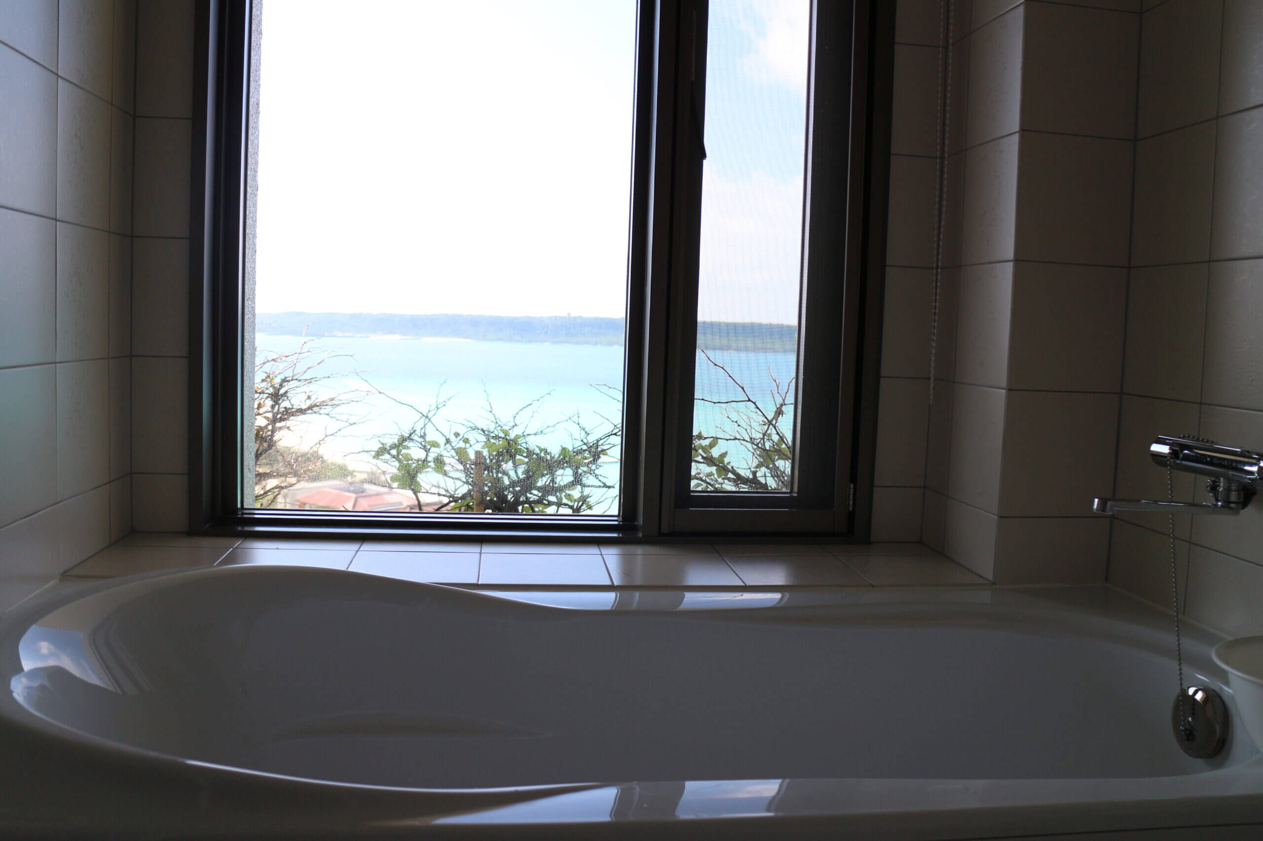 お風呂の窓から沖縄の海が見えるオーシャンビューの写真です。