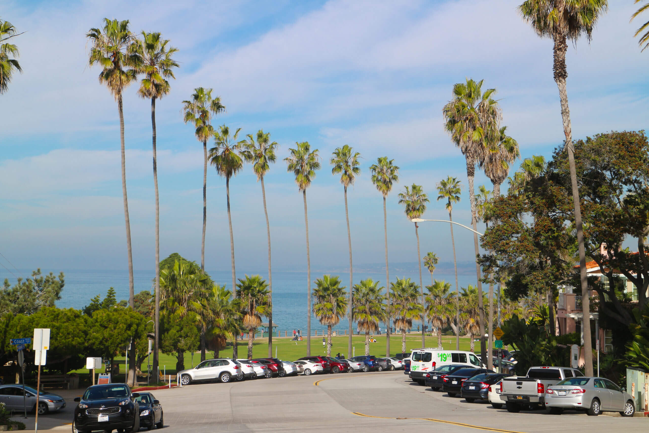 ヤシの木がある海の見える道路の写真