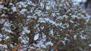 積もった雪と植物のアップの写真