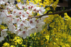 満開の桜と黄色い花の写真